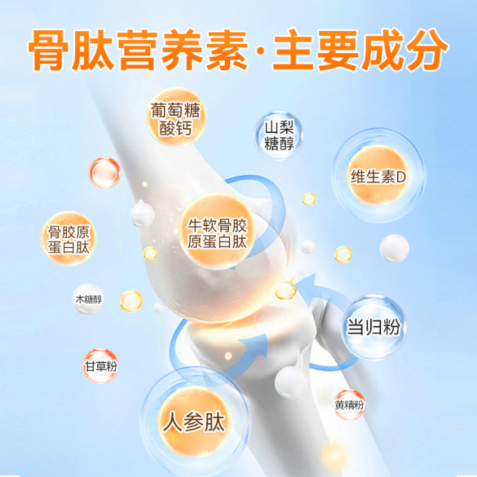 1. 配方权威性与科学性:配方遵循“骨骼支撑者(钙)、混凝土(骨胶原)、润滑剂(蛋白多糖)、加油站(维生素D)”的骨骼健康理论,复配多种药食同源成分,实现“补益气血、补充营养、促进合成”三重协同。